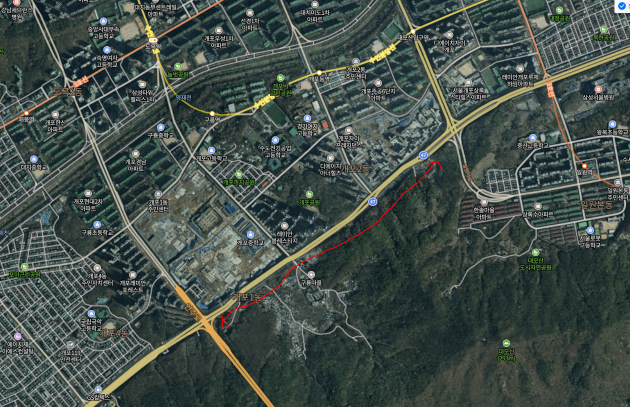 기존의 8차선 도로가 보입니다. 개포 주공이 재개발하면서 땅을 기부하였는지? 현재는 아래 사진의 왼좌측 영역에 도로로 되어 있습니다.