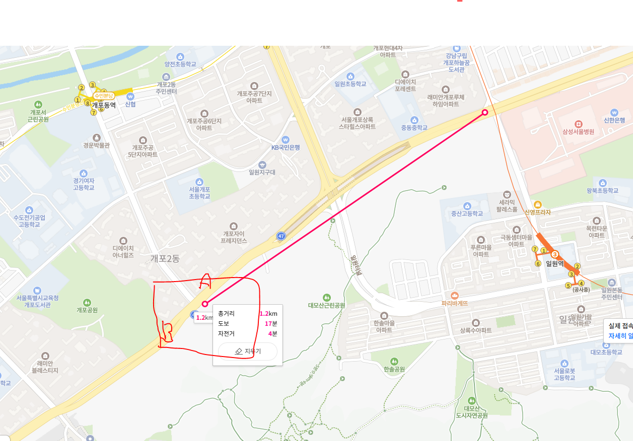 개인적인 의견 사항은 B 부근에서 개포동역으로 가는 좌회전을 일시적으로 없애는 것이다.