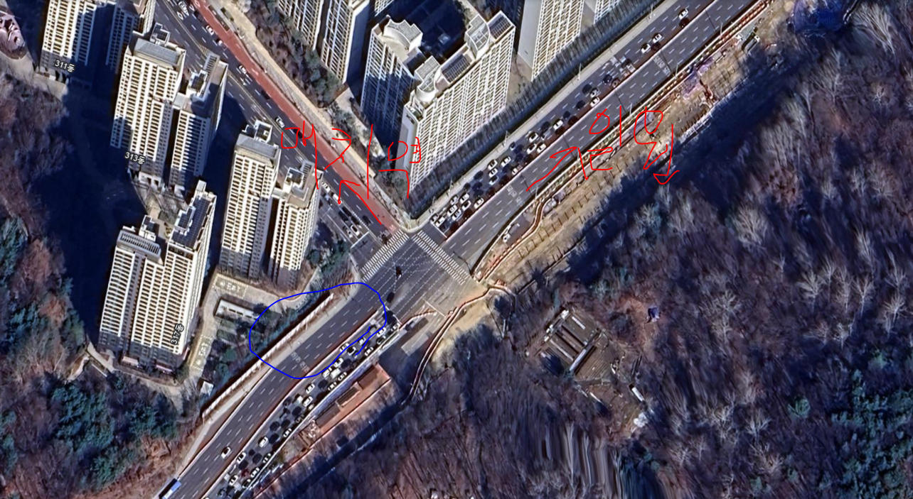 현재는 아래 그림의 타원형쪽이 4차선으로 바뀌어, 조금 소통이 원활해졌다.