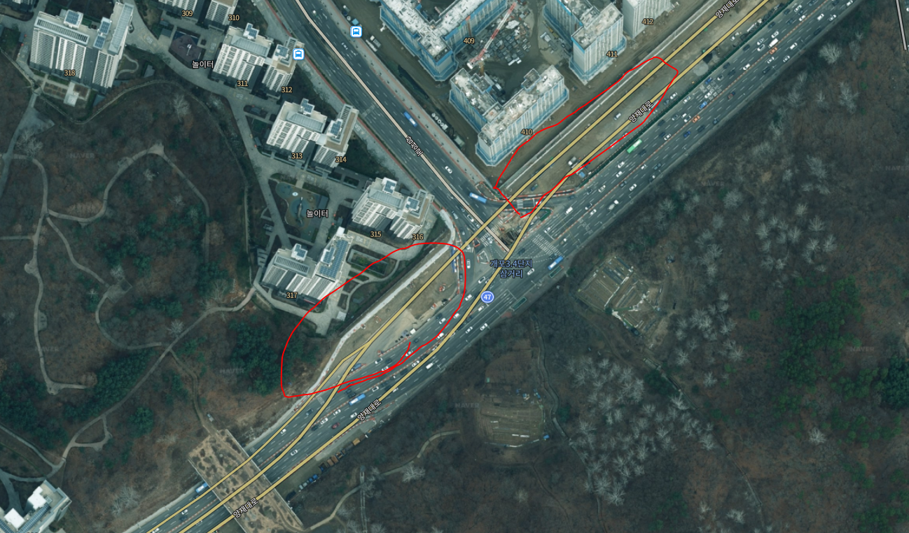 아래 그림 중 빨간 선은 공사구간을 나타냅니다.