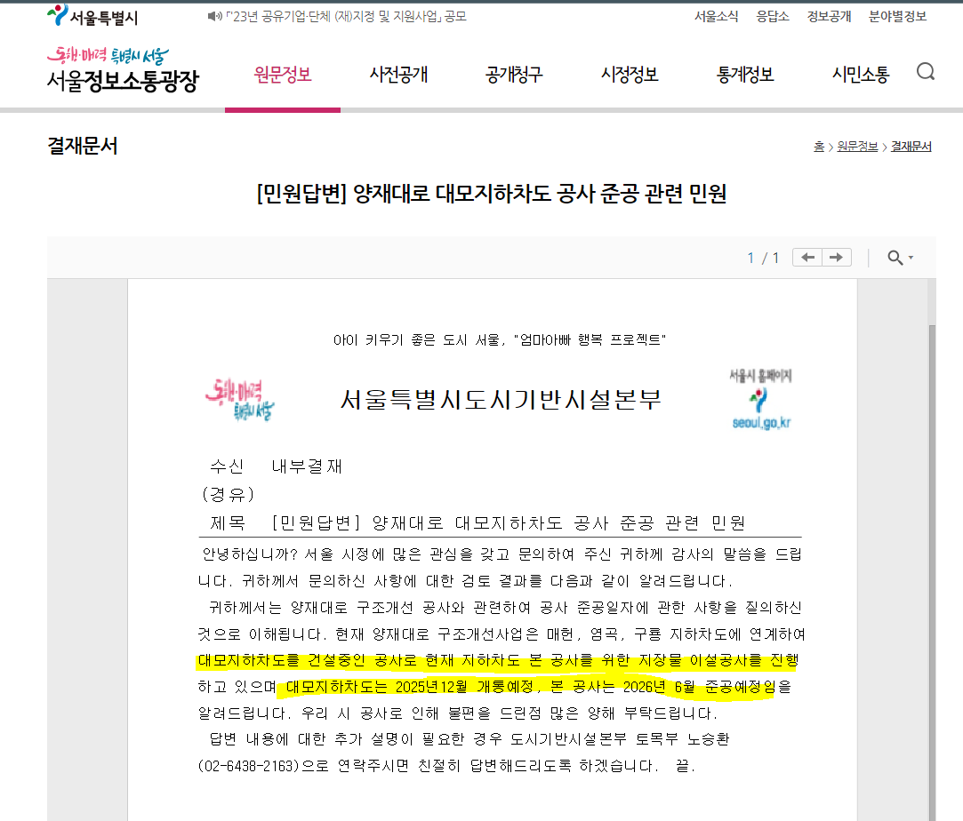 양재대로 대모지하차도 공사 준공 시기는 2026년 6월에 준공예정이라고 합니다.