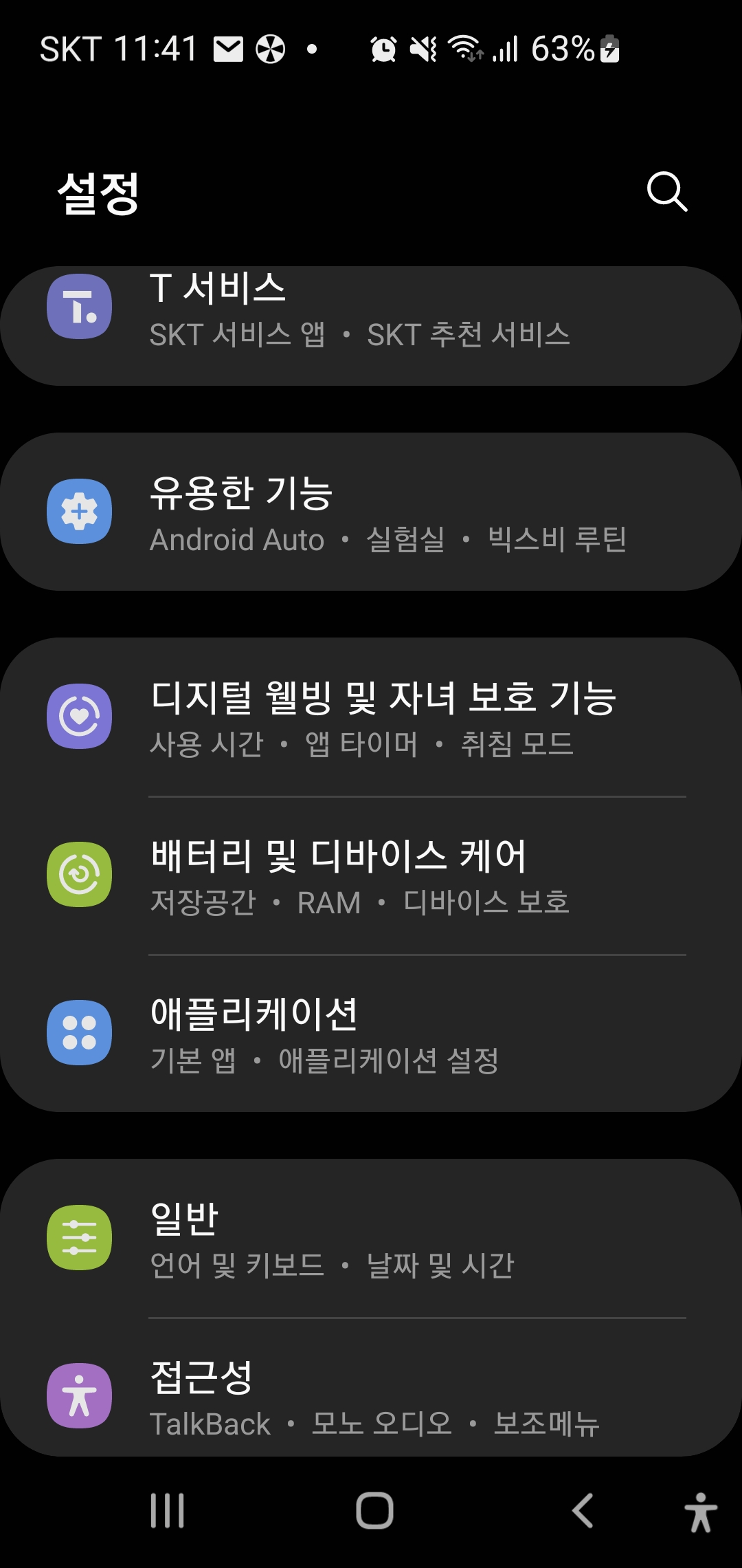 1. '설정'앱을 수행 후, 화면 메뉴