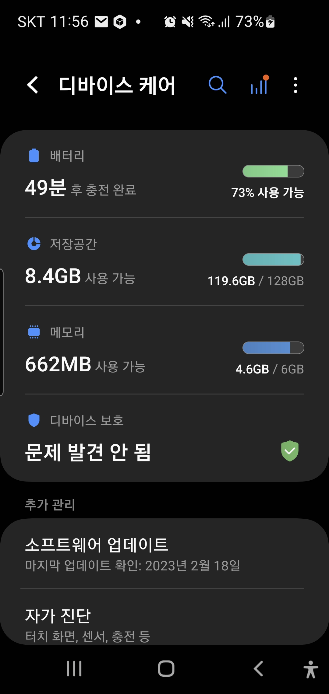 '설정' -> '배터리 및 디바이스 케어'에서 확인 가능합니다.