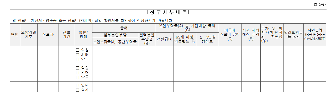 지원일수는 입원 및 외래 진료를 합하여 180일까지... 즉 180일 동안 의료비 부담기준 금액을 초과한 경우 신청하면 됩니다.