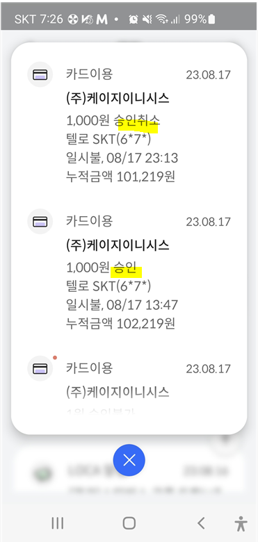 상기와 같이 구현해 보면, 실제 결제가 됩니다. 다만, 결제된 금액은 자정 부근에 '승인 취소'됩니다.