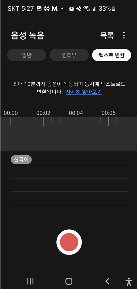 10분까지 녹음되고 동시에 텍스트(글자)로도 변환되어 보여지게 됩니다.