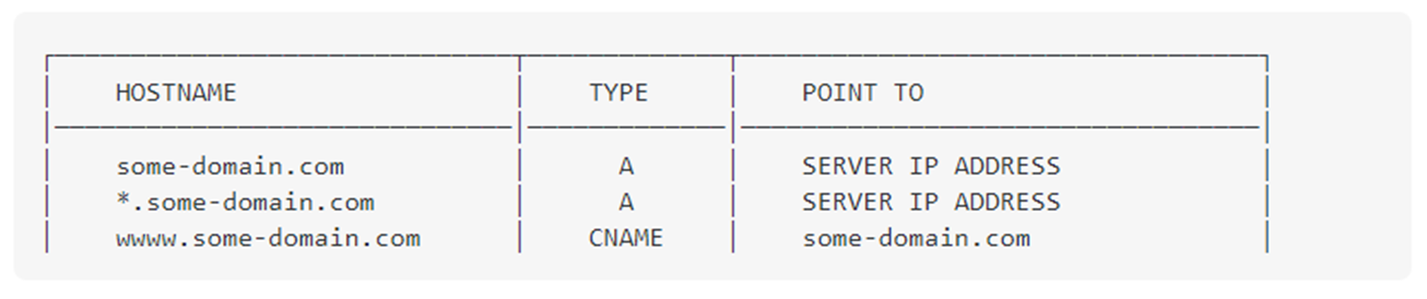 즉, *.some-domain.com 을 특정 IP의 서비스로 연결시키는 것입니다. * 의 자리에는 임의 길이의 임의 글자가 들어갈 수 있죠. 예를 들면, www.some-domain.com , a.some-domain.com , zzzzzzzzz.some-domain.com