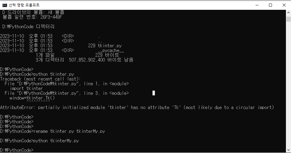 파일명을 tkinter.py로 하여 tkinter 라이브러리를 임포트하는 것과 충돌됨.