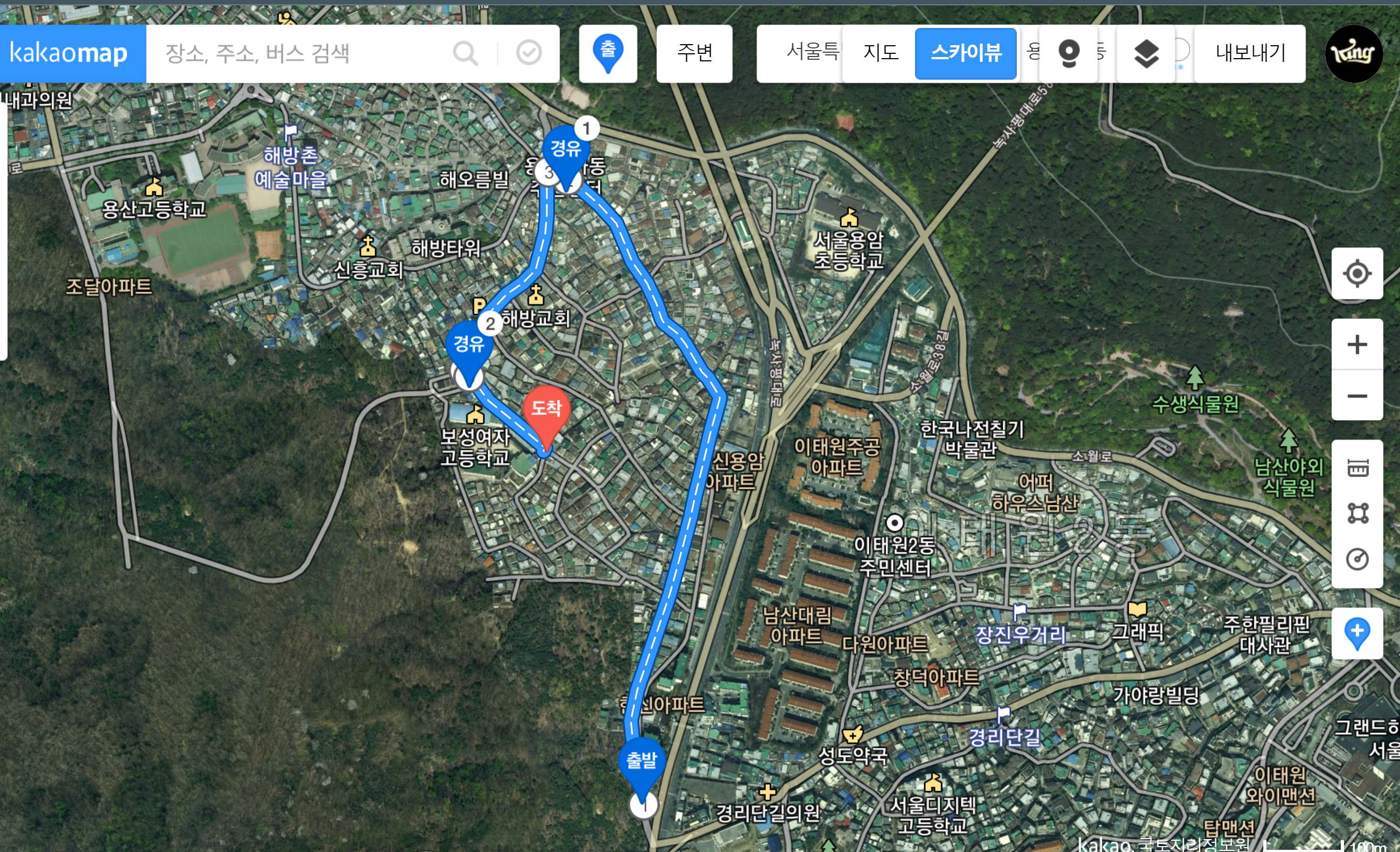 이동 경로는 아래 그림과 같았습니다. 녹사평역 2번 출구로 나와 신흥로 입구에서 시작하였습니다.( 녹사평역 내부 구조도 많이 특이했습니다. ) 신흥로 초입에서 외구계열 카페와 음식점이 있어서 조금 생경한 느낌을 받을 수 있습니다. 주택 구조는 거의 70년대 말, 80년대의 양옥집들이 많았습니다. 용산 02번 버스가 아주 자주 디니는 길이었습니다. 용산 02번 버스는 녹사평역에서 시작하여 멀리 숙명여대까지 가는 것 같았습니다. 해당촌의 구릉지가 걷기에 부담스러우면 용산 02번 버스로 투어(?)하는 것도 권장 드립니다. 용산 2가동 주민센터 주변 바로 위에는 남산의 소월길과 접해 있습니다. 그 이후로는 조금 평탄한 길로 해방 교회 및 천주교 성당까지 이어집니다. 역시 고저차가 엄청난 곳이었습니다.