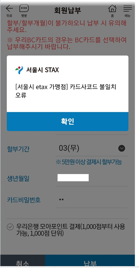 "서울시 etax 가맹점 카드사 코드 불일치 오류"