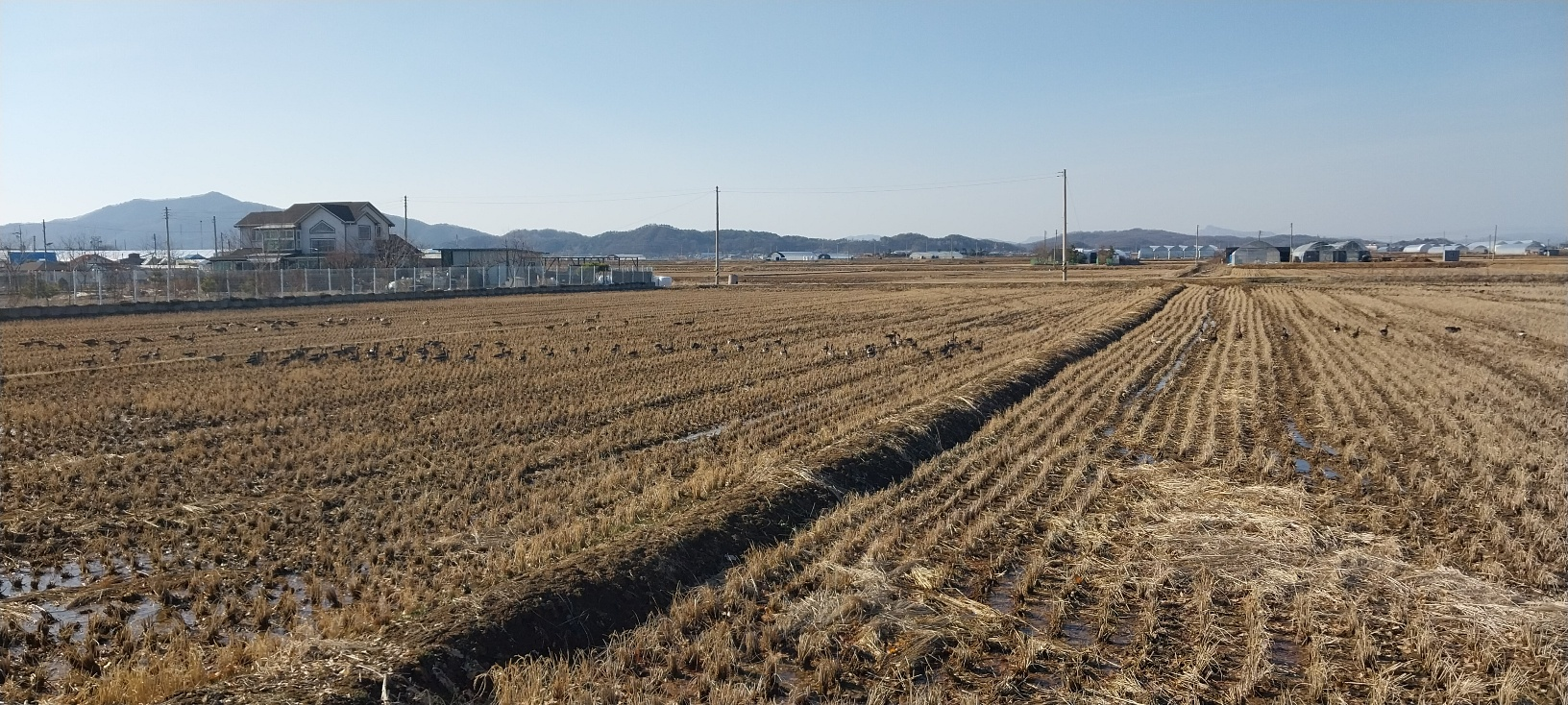 논이 있는 평지에서 강은 푹 꺼진 형태로 강을 형성하고 있습니다. 둑이 있는 강이 아닙니다.