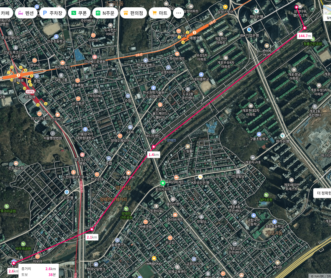 양재천 산책로를 따라 이동하면 약 40분만에 도착할 수 있습니다.