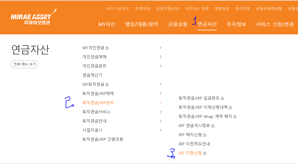 - 로그인 후 상단 메뉴에서 '연금자산' -> '퇴직연금/IRP관리' -> 'IRP이전신청'