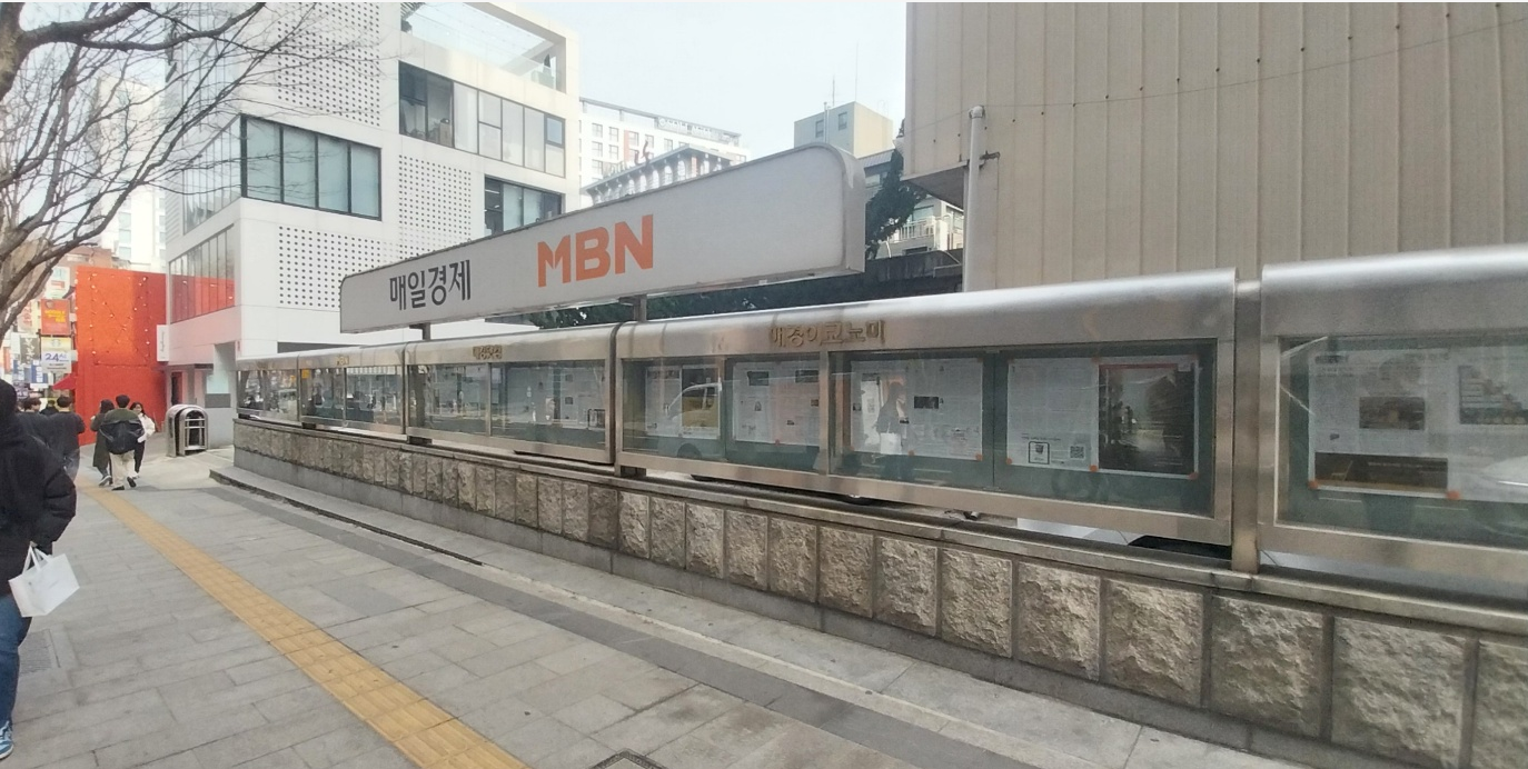 충무로역에 거의 도달하면 매일경제 사옥이 나옵니다. 길가의 게시판 구조에 신문을 쭉 펼쳐서 오늘날짜의 여러 면을 전시하고 있습니다. 북한의 노동신문 또는 대학의 대자보처럼. 요즘의 디지털 시대에 예전 아날로그 느낌을 주더군요. 그리고 여기 건물, 충무로역 기준으로 북동쪽의 건물이 예전부터 있던, 매일경제 사옥이 아닌가 합니다. 주로 눈에 띄는 남서쪽에 있는 더 높은 건물은 MBN 등 신사옥이 아닌가 싶습니다.