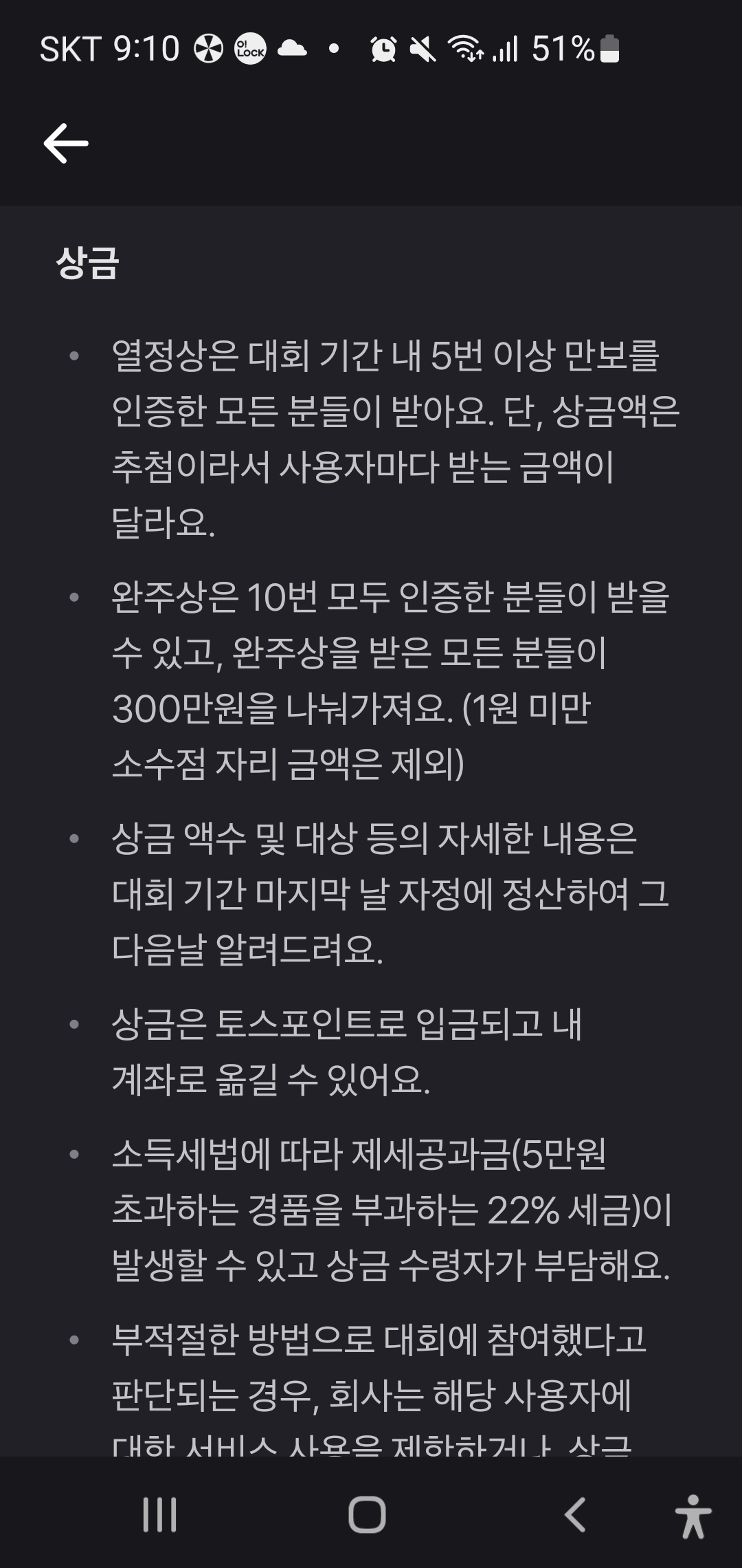 토스뱅크가 설 연휴 기간을 포함하여 10일 동안 만보 걷기 대회를 개최하고 있습니다.(하였습니다.)