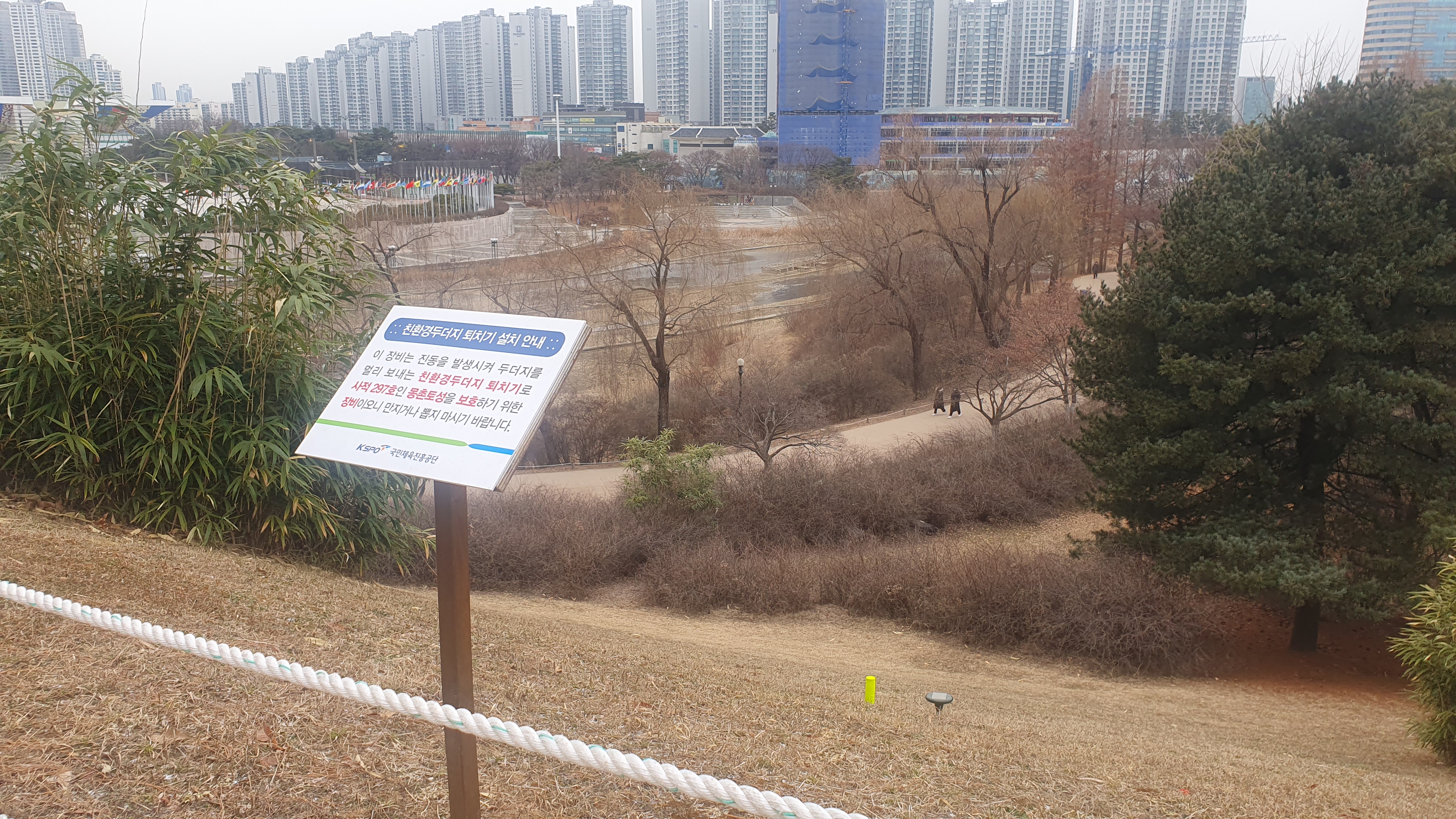 몽촌토성의 둘레길을 걷다가 발견한 안내판에 두더지 퇴치기가 설치 되어 있으니, 산책하시는 분들이 임의로 뽑거나 신고를 하지 말아달라는 당부의 안내글이 게시되어 있음을 보았습니다.