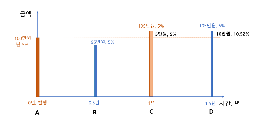 발행시장 :: (고정) 발행금액, 이율, 만기 날짜 는 고정됨. ( 아래 그림 에서 A , C에 해당 )
