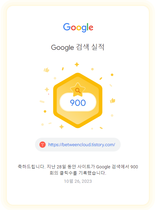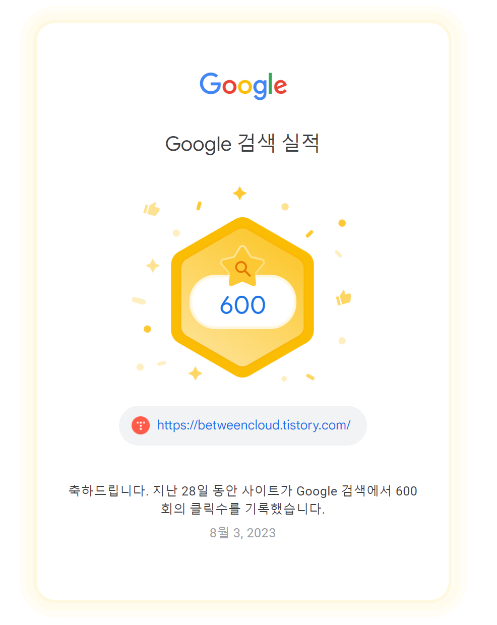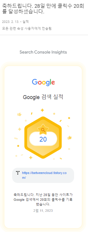 2월 8일 최초로 구글 검색엔진과 연결된 후, 2월 11일에 '검색 후 20회 클릭수' 실적을 축하한다는 메시지를 받았습니다.