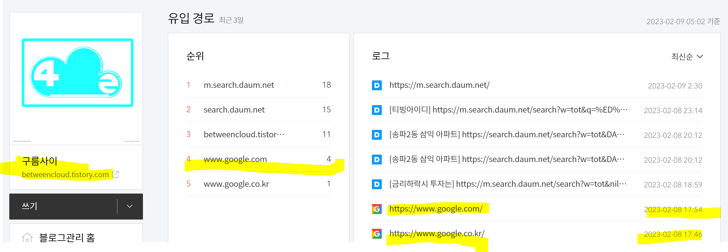 티스토리를 초기 구축하면서 구글이나 네이버 검색엔진 연동을 위한 조치/액션이 필요하다고 인지는 하였으나, 글을 작성하고 올린다고 연동작업을 깜박하고 잊어버리고 있었습니다. 그리고 차츰 방문통계 및 유입경로를 보면서 다시 의문이 들었죠? 왜 네이버에서는 내 글이 검색이 되지 않을까? 처음에는 경쟁사이므로 상호 배타적으로 상대적의 자료를 '서비스'하지 않는다. 즉 인덱싱은 되어 있지만 검색결과에 나타나지 않게 하거나 검색의 후순위 페이지에 위치시키는 것으로 이해했습니다. 그래서 네이버 검색에서 내 글이 아닌 다른 검색어를 쳐보니, '어, URL에 tistory.com 인 것이 나타나네'..mmm. 검색을 하여 연동 조치를 2023년 2월 6일경에 하였습니다. 드디어, 2월 8일 저녁에 구글에서 검색으로 제 글이 나타났고, 다른 사람에 의해 접근이 되었습니다.( 아래 그림 참조). 이미 구글로 연동되었는지는 site: 명령어 조회는 완료하였지만 다른 사람이 접근하는 것은 처음 목격(?)하였습니다.