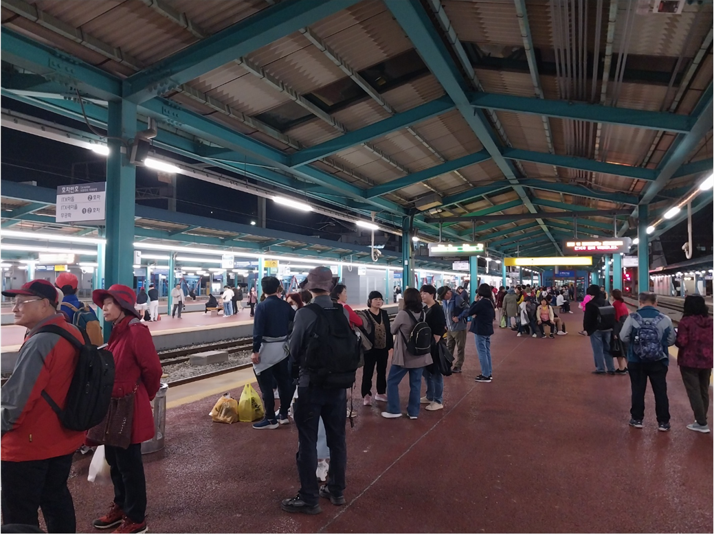 복귀할 때의 익산역 플랫폼에서 기차를 기다리는 모습입니다. 약 200여명되는 것 같습니다. 익산 구시장에서 이른 저녁을 먹고서 7시 3분쯤 서울로 출발합니다.