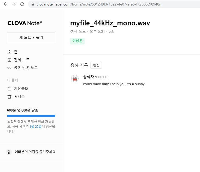 웹기반 사용자인터페이스를 제공하는 네이버의 클로바노트에서는 'could mary may i help you it's a sunny'로 인식되었다.