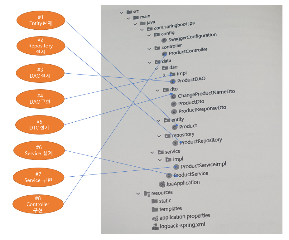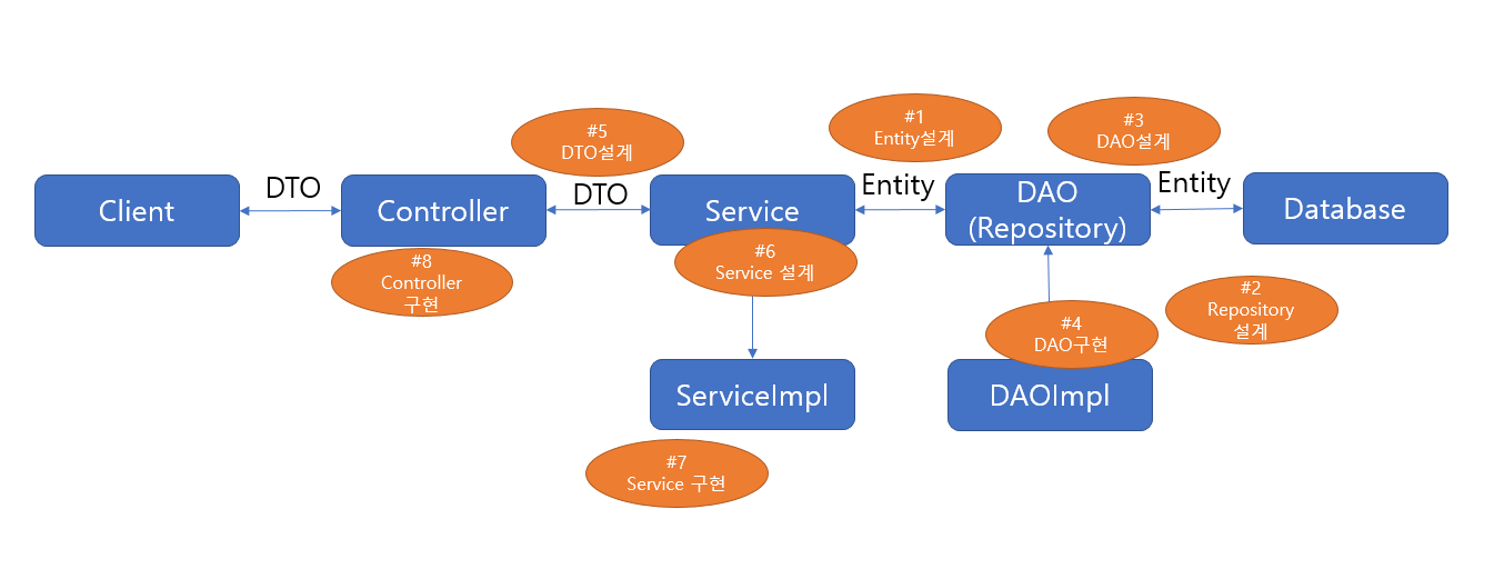 Layered 구조 체계에 맞게 개발한 interface 설계 및 class 구현체의 결과물은 아래 그림과 같습니다.